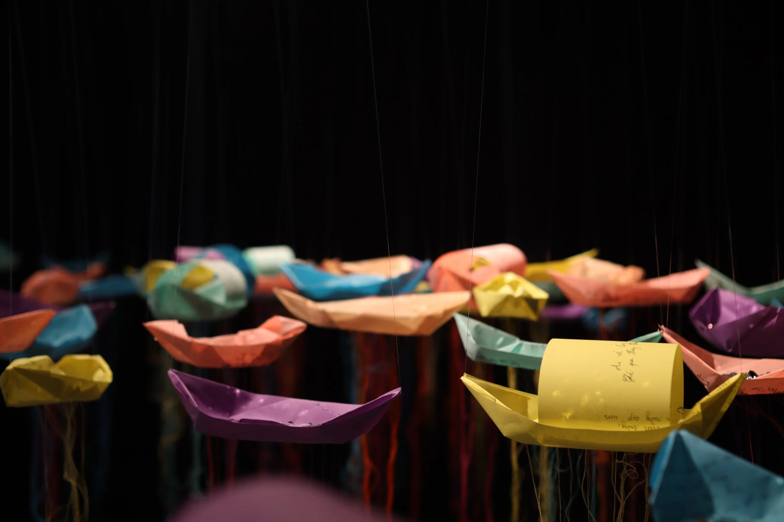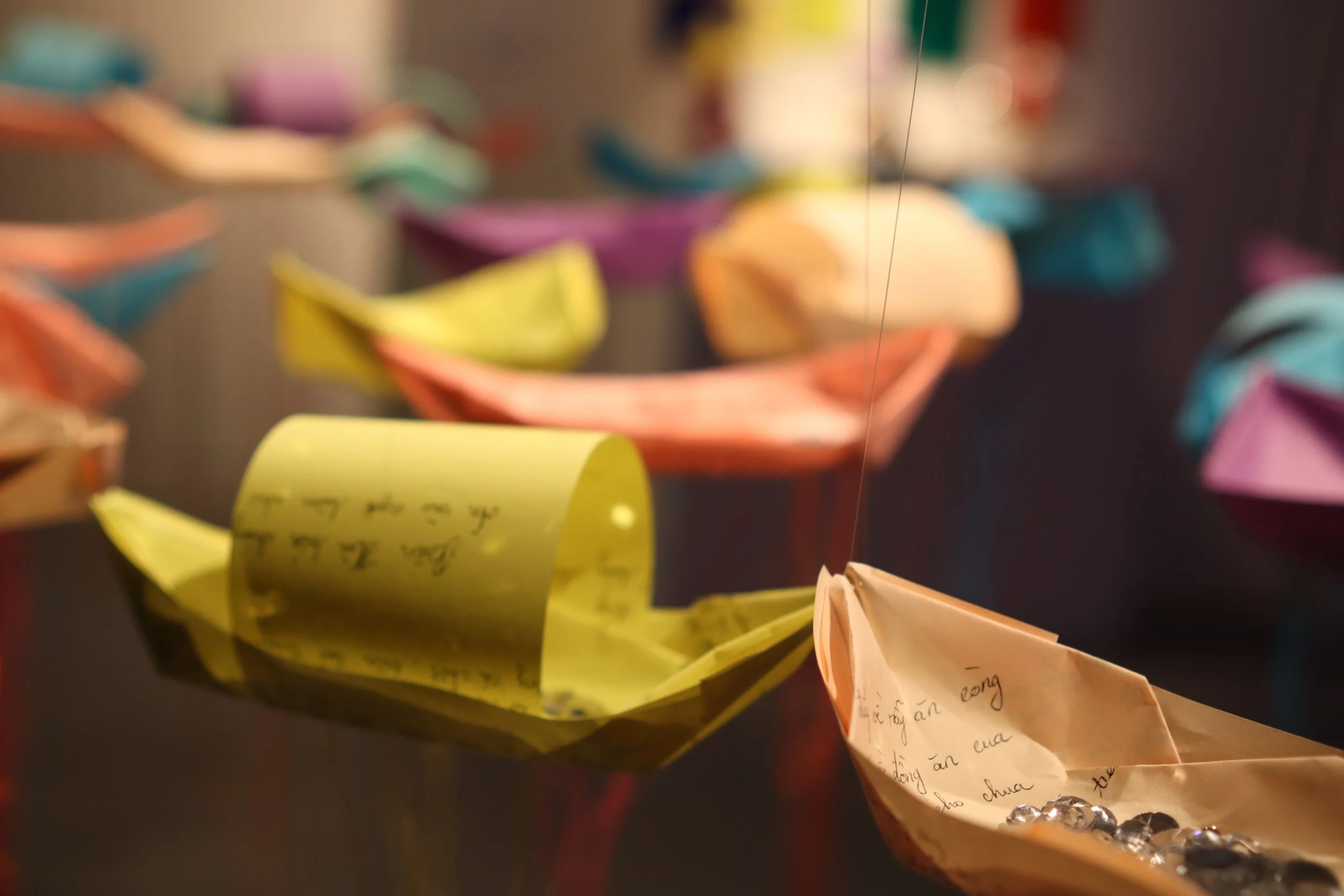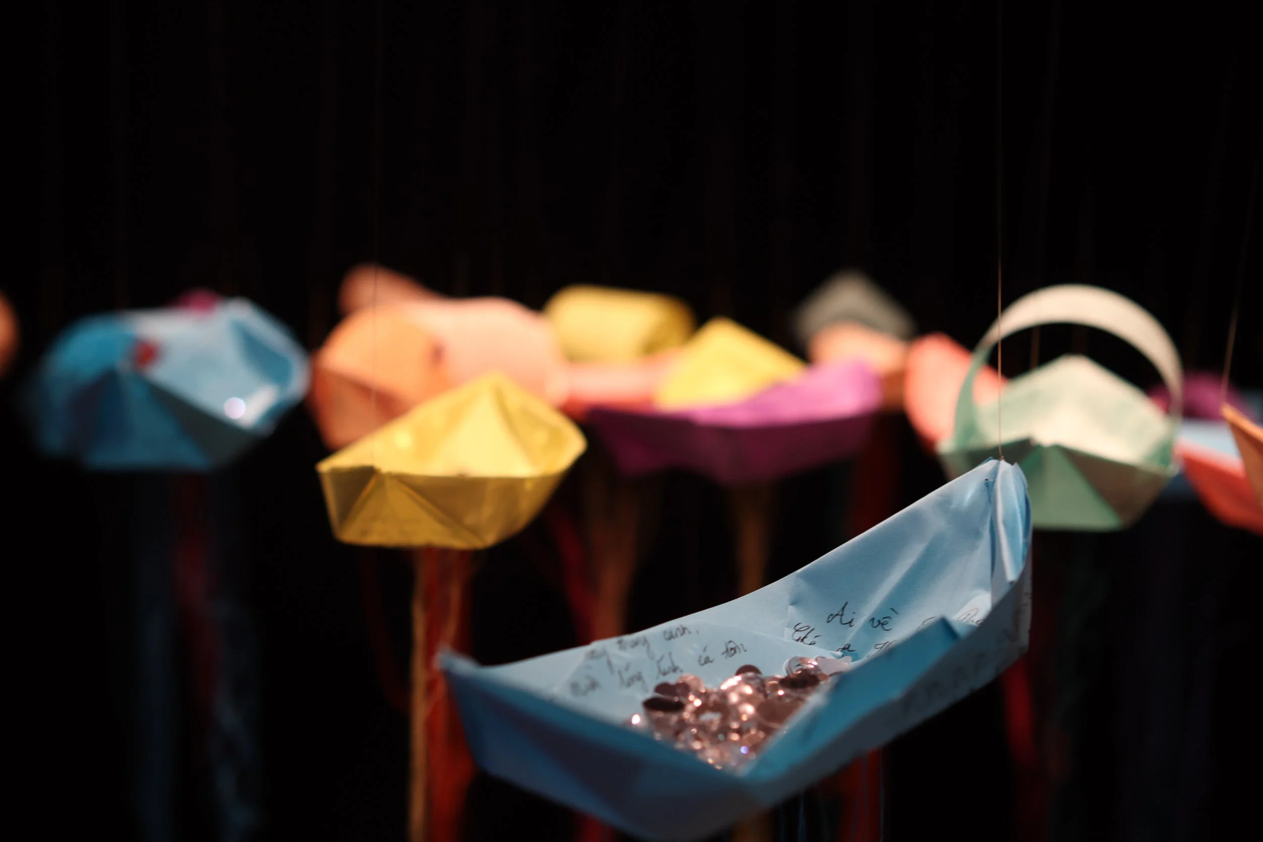 This installation features colorful paper boats suspended mid-air, each trailing long strands of threads in different colors. Referencing both the Mekong Delta’s riverine culture and personal migration journeys, the boats evoke themes of travel, memory, and fragility. Boats filled with crystal rhinestones, suggests emotional weight, memories, ancestral history. This installation recalls childhood memories and reflects on identity.