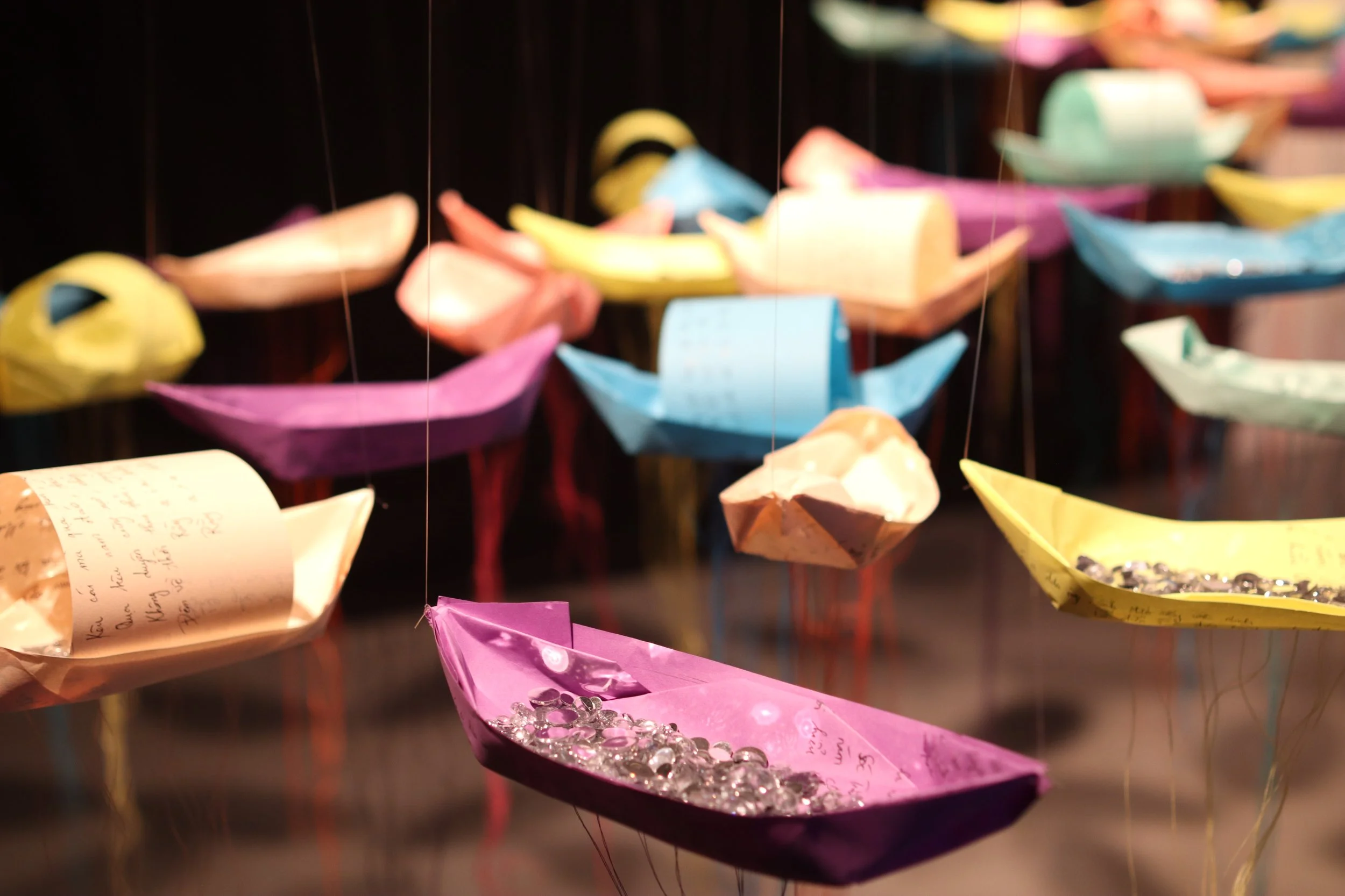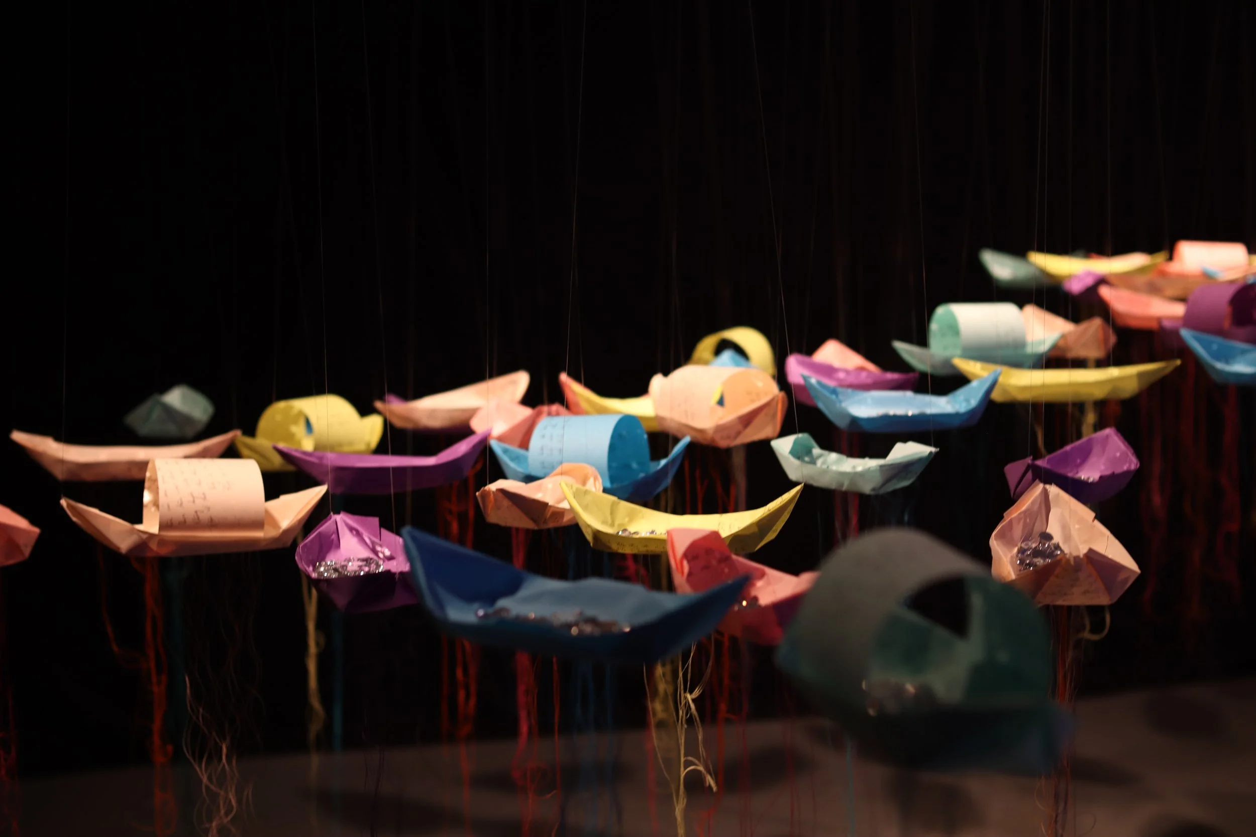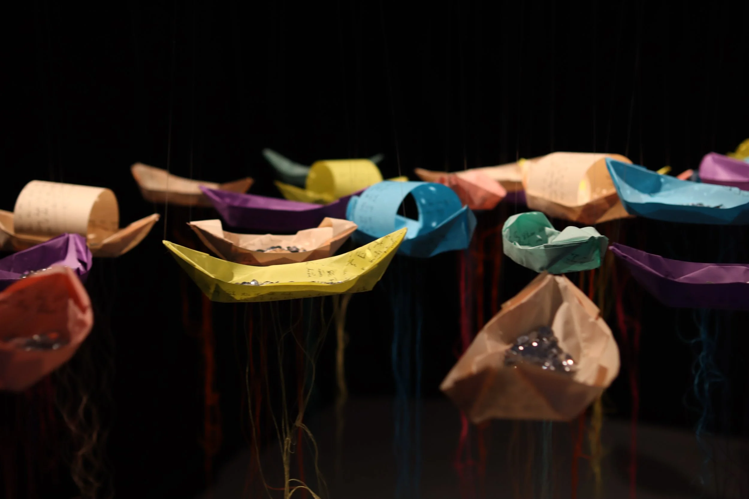 This installation features colorful paper boats suspended mid-air, each trailing long strands of threads in different colors. Referencing both the Mekong Delta’s riverine culture and personal migration journeys, the boats evoke themes of travel, memory, and fragility. Boats filled with crystal rhinestones, suggests emotional weight, memories, ancestral history. This installation recalls childhood memories and reflects on identity.