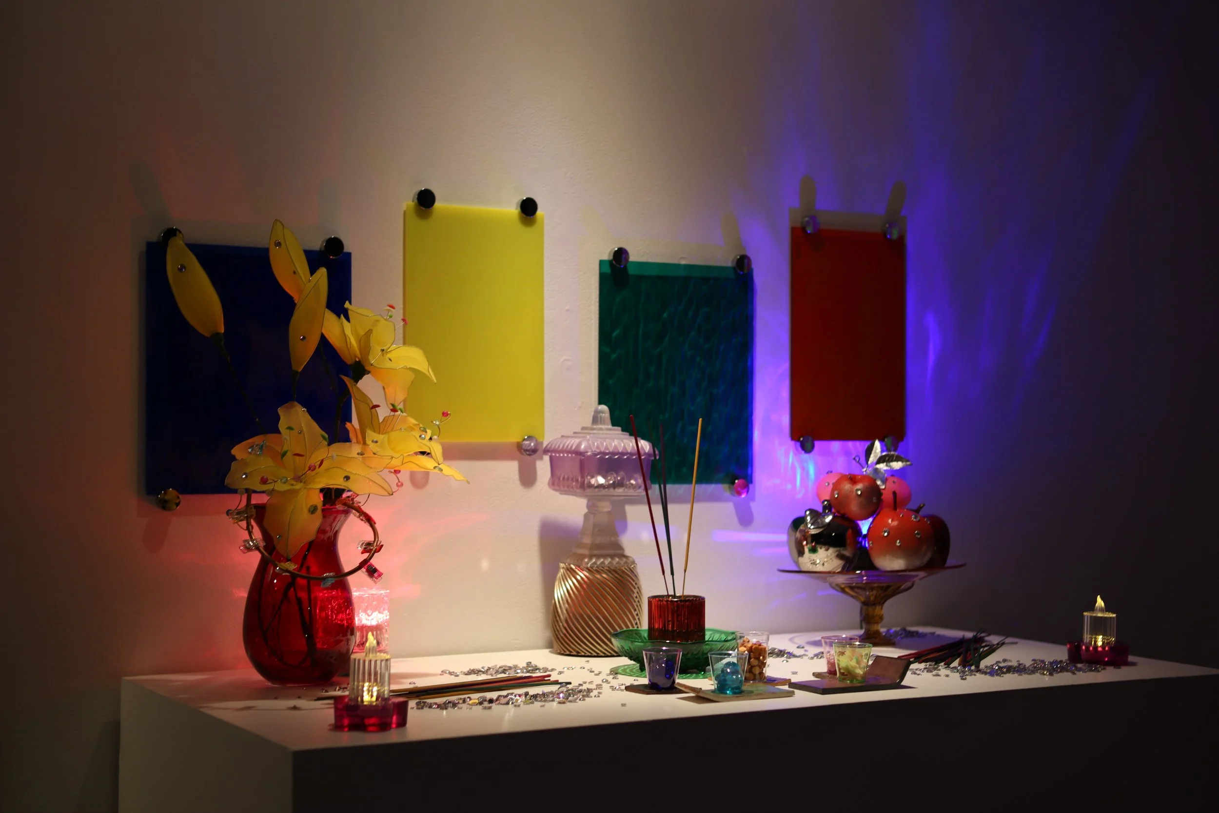 This installation reimagines a traditional Southern Vietnamese ancestral altar through a contemporary and queer lens. Drawing from the region’s rich decorative customs, the work features vibrant colored panels, artificial flowers, glittering fruit, and scattered offerings bathed in glowing light. Blurring the sacred and the playful, it honors memory, identity, and cultural heritage while transforming the altar into a space of personal devotion, performance, and radiant excess.