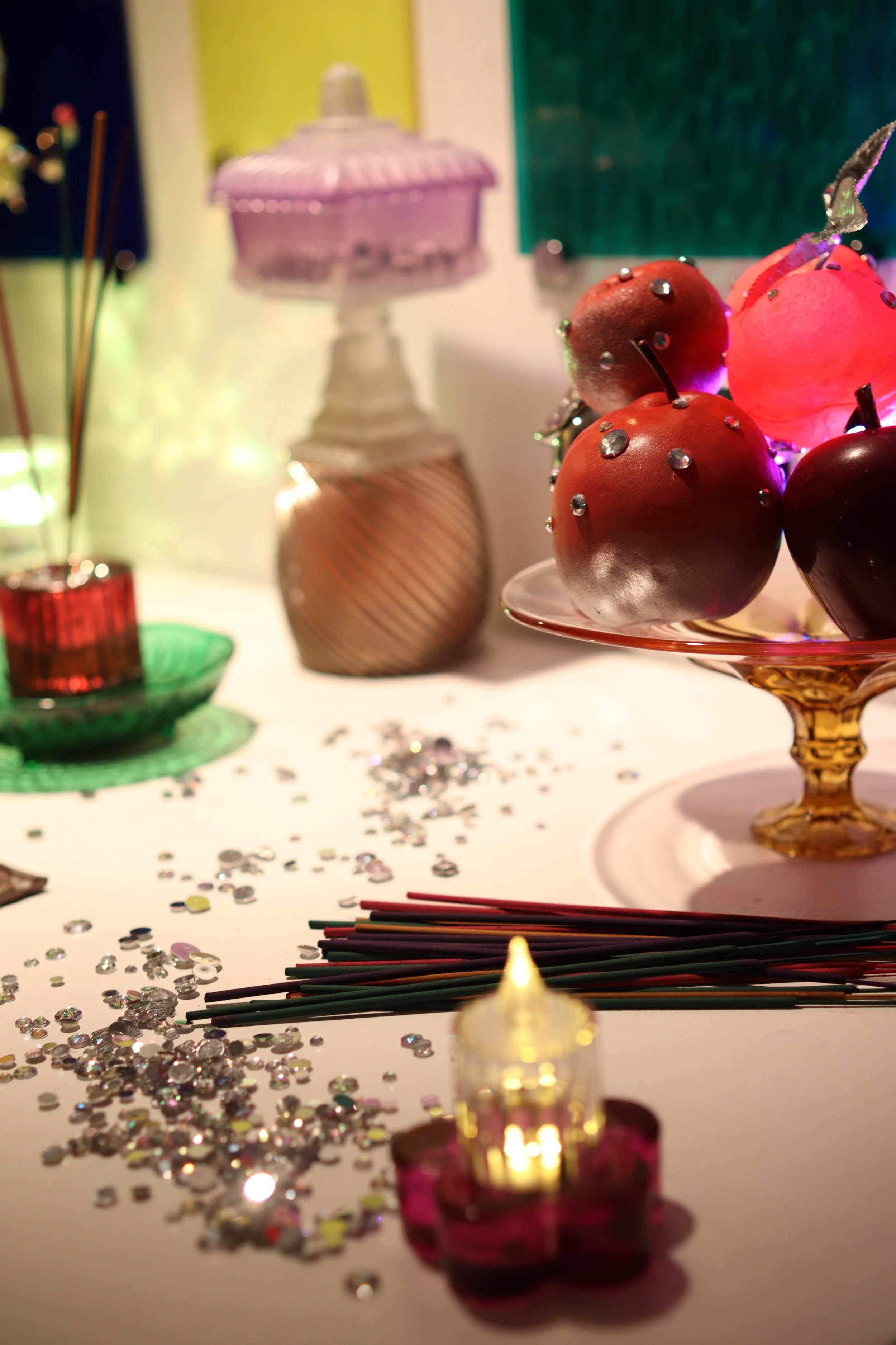 Medium: glass, ceramic, nylon stocking fabric, wires, colored beads, rhinestones, wax, incense, artificial fruits, LED lights, and candles.