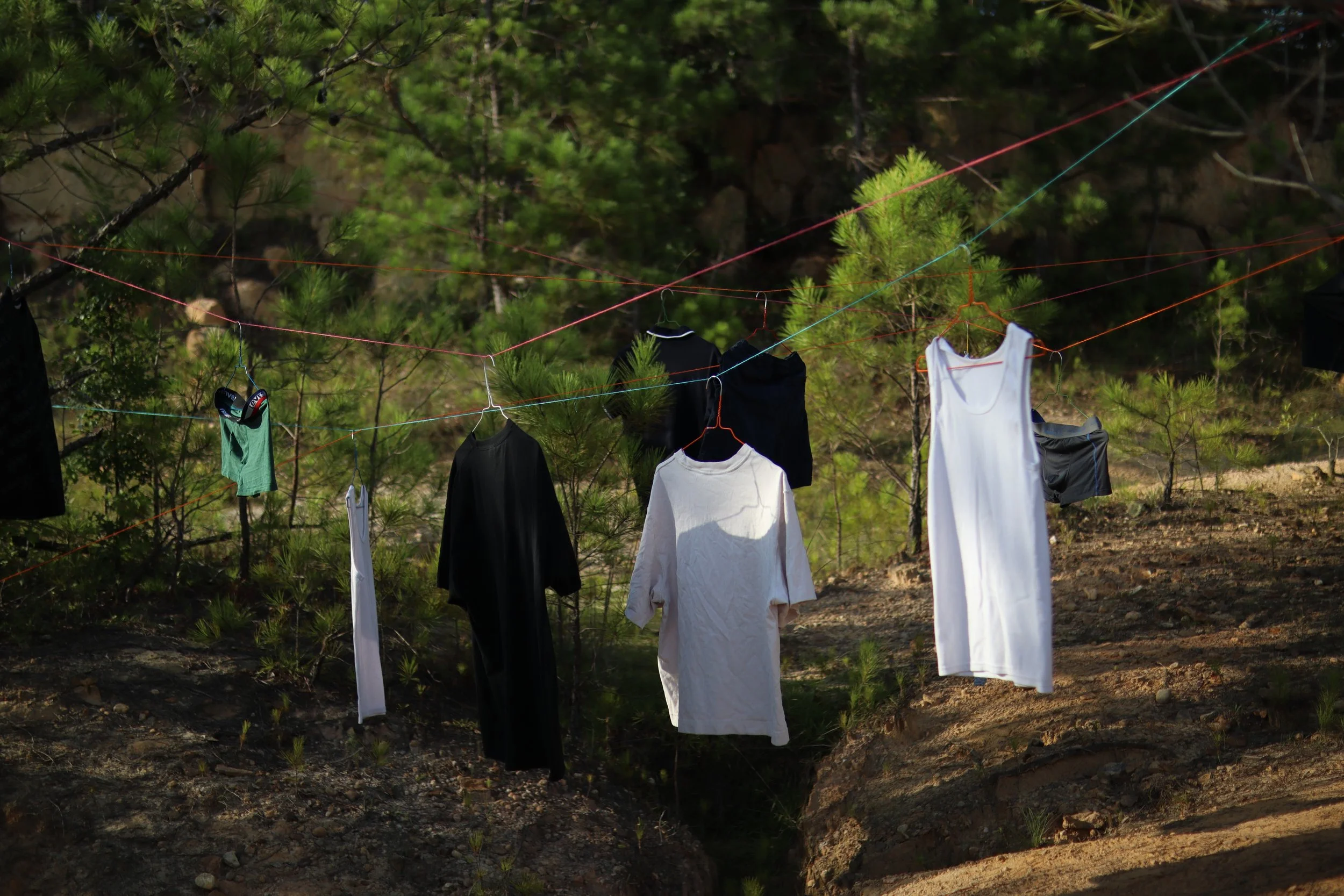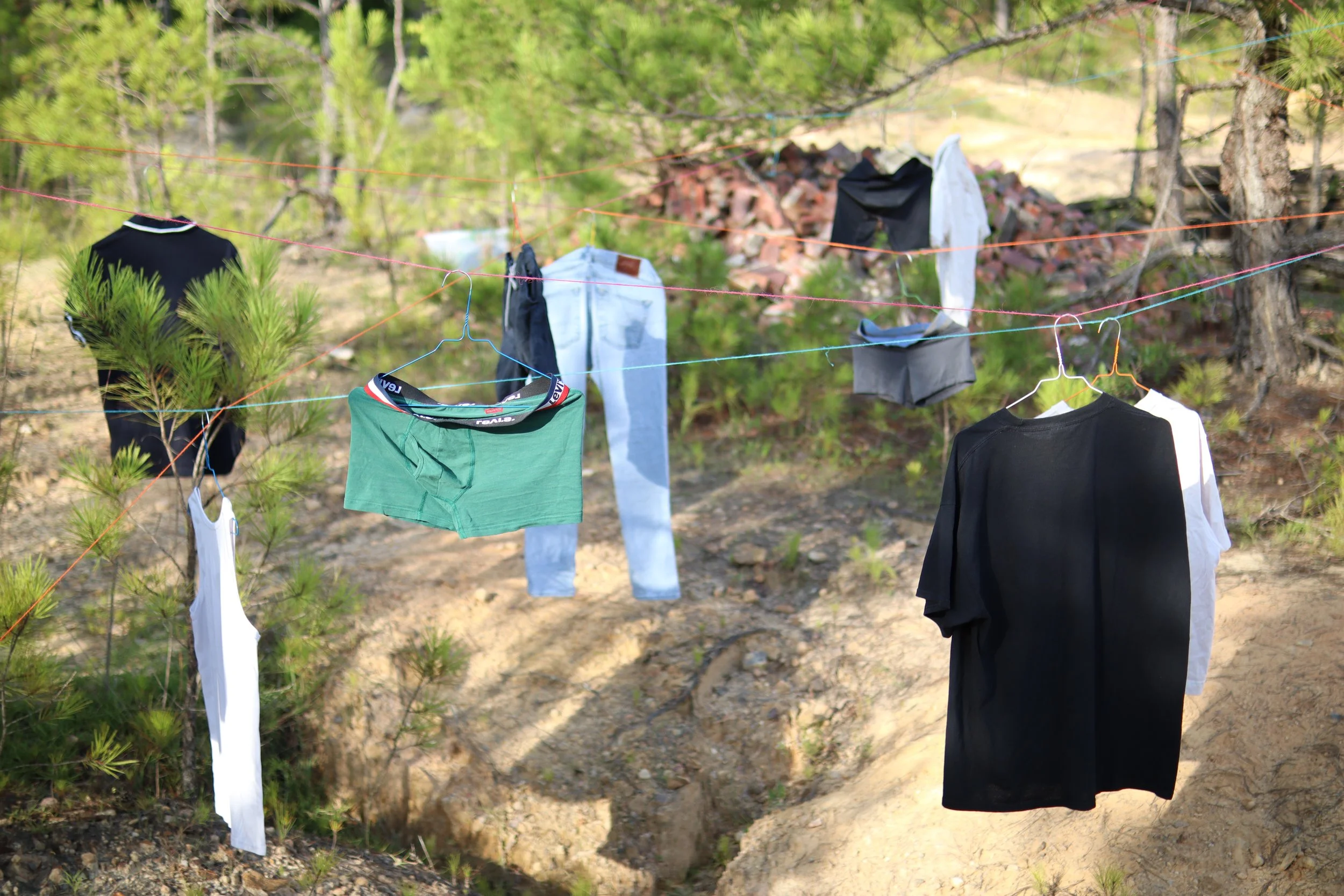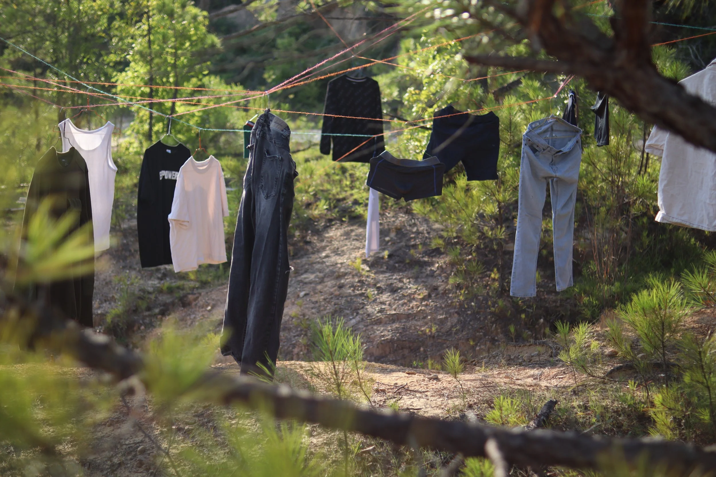 Abandoned. Used to Be His is a site-specific installation composed of garments once exchanged or gifted by my formal lovers. Hung across a barren, eroded landscape among young pine trees, the clothes float in open air like quiet remnants of intimacy and memory. By placing these personal objects in nature—exposed, weathered, and distant from domesticity—the work reflects on themes of love, loss, and emotional residue. The installation becomes a quiet act of mourning and release, evoking the vulnerability of queer attachment and the bittersweet traces left behind.